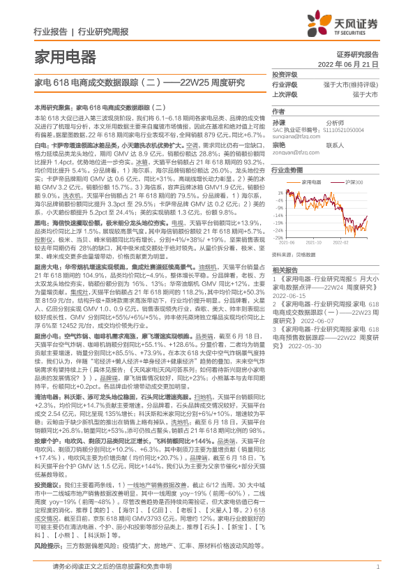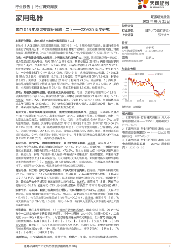 【天风证券】【20220621】家用电器22W25周度研究:家电618电商成交数据跟踪(二)-21页