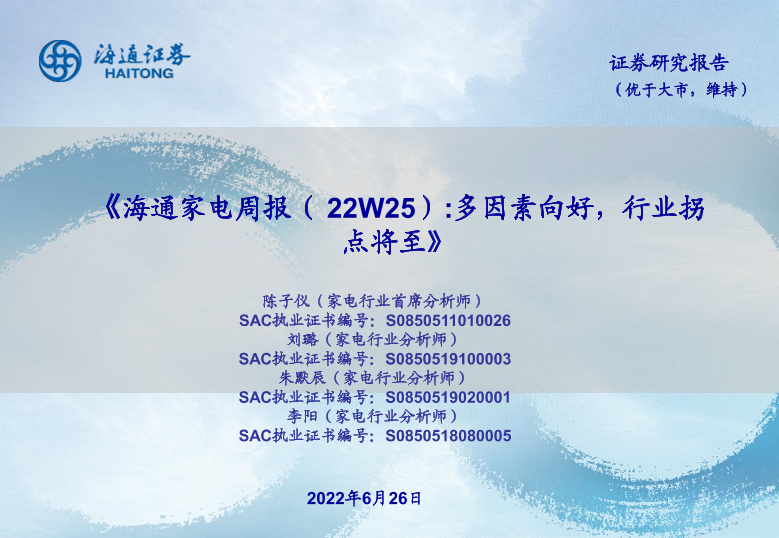 【海通证券】【20220626】海通家电周报(22W25) 多因素向好,行业拐点将至-15页