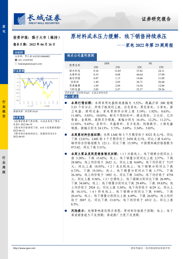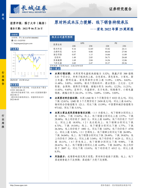 【长城证券】【20220626】家电2022年第25周周报:原材料成本压力缓解,线下销售持续承压-12页