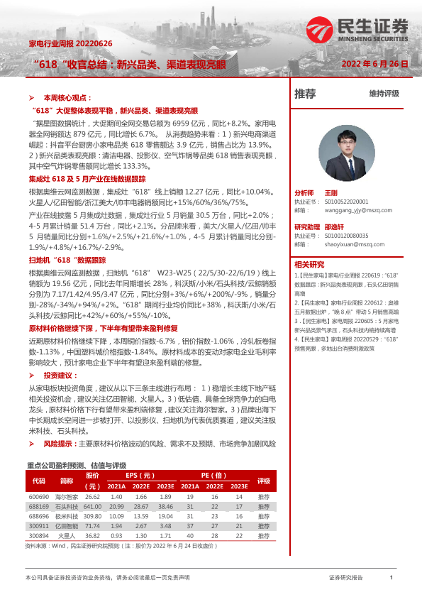 【民生证券】【20220626】20220626-民生证券-家电行业周报:“618”收官总结:新兴品类、渠道表现亮眼-17页
