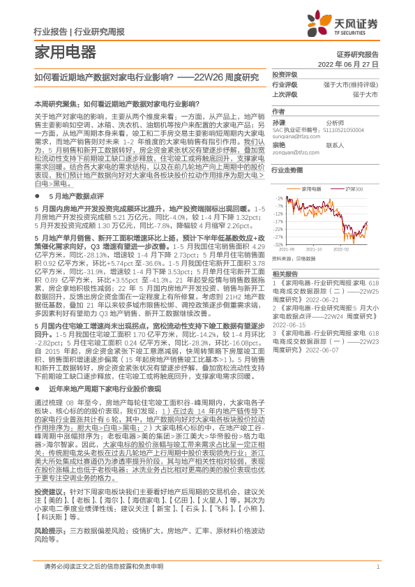 【天风证券】【20220627】20220627-天风证券-家用电器22W26周度研究:如何看近期地产数据对家电行业影响?-16页