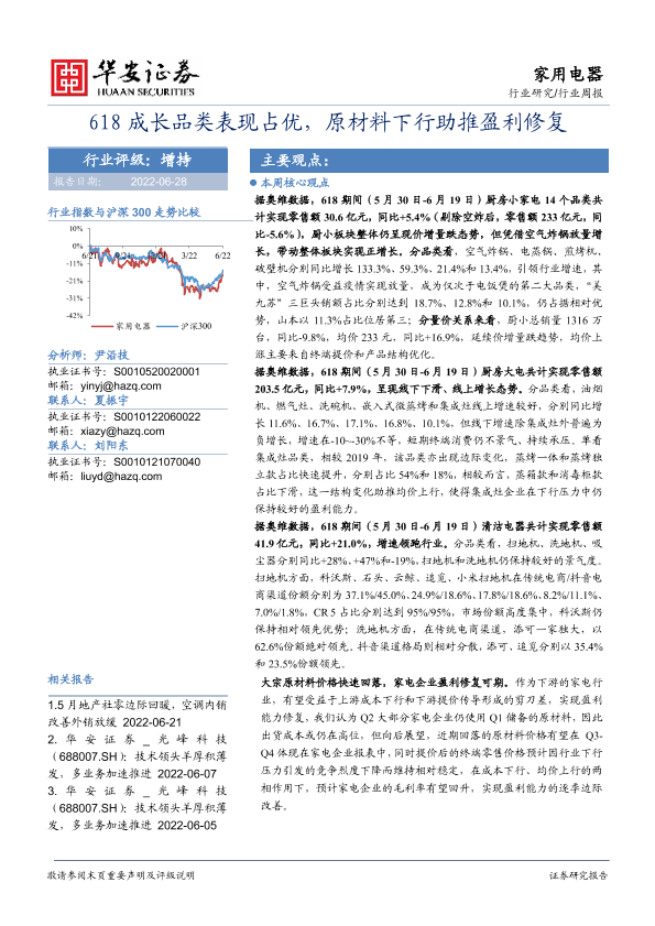 【华安证券】【20220628】20220628-华安证券-家用电器行业周报:618成长品类表现占优,原材料下行助推盈利修复-16页