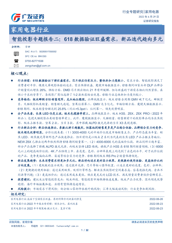【广发证券】【20220629】家用电器行业:智能投影专题报告二:618数据验证旺盛需求,新品迭代趋向多元-32页