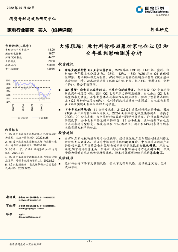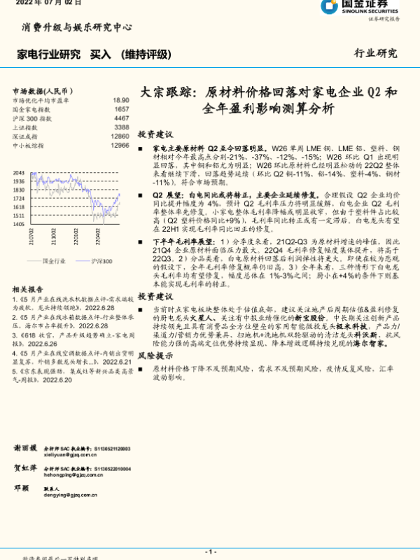 【国金证券】【20220702】大宗跟踪:原材料价格回落对家电企业Q2和全年盈利影响测算分析-9页