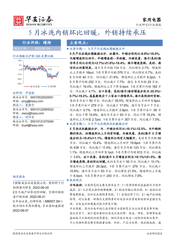 【华安证券】【20220704】20220704-华安证券-家用电器行业周报:5月冰洗内销环比回暖,外销持续承压-21页