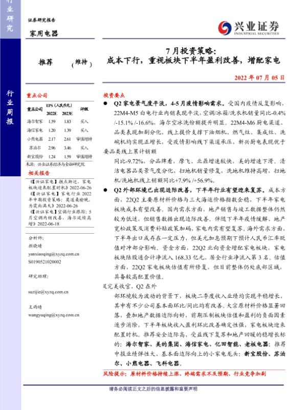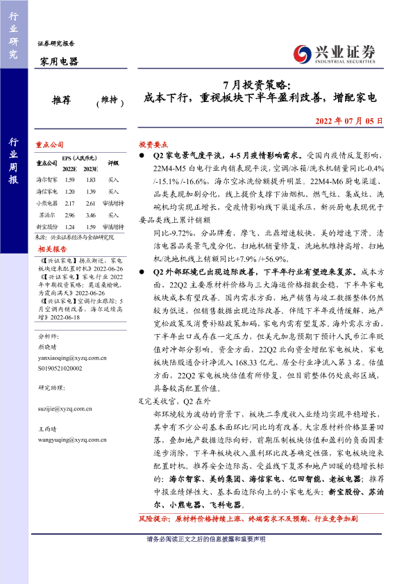 【兴业证券】【20220705】20220705-兴业证券-家用电器行业7月投资策略:成本下行,重视板块下半年盈利改善,增配家电-19页