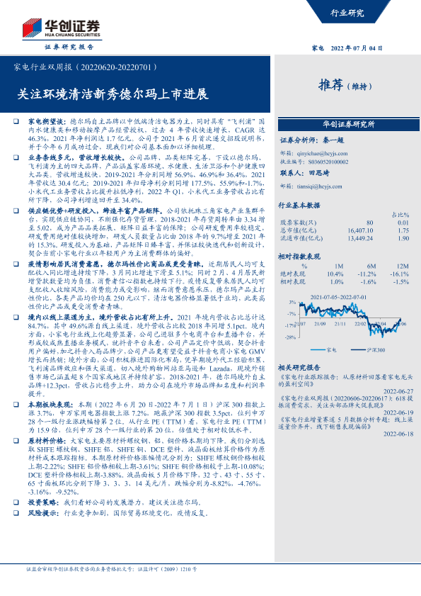 【华创证券】【20220704】家电行业双周报:关注环境清洁新秀德尔玛上市进展-26页