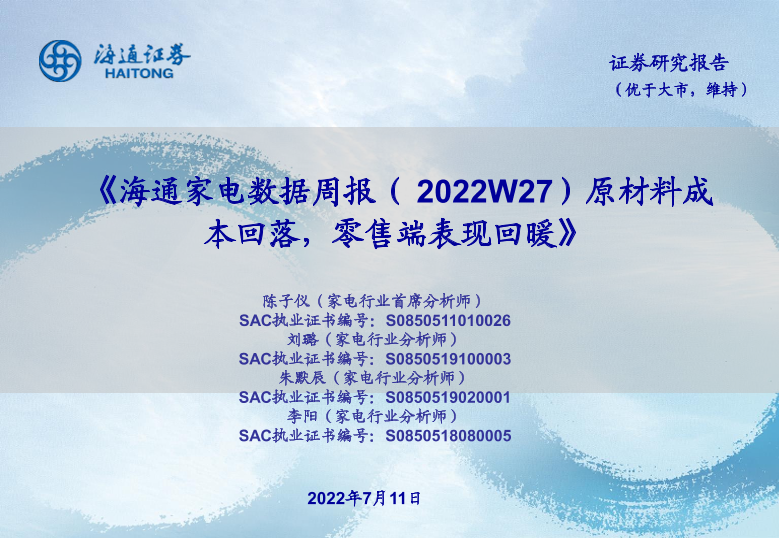 【海通证券】【20220711】海通家电数据周报(2022W27)原材料成本回落,零售端表现回暖-19页