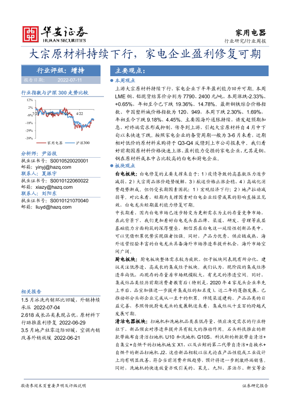 【华安证券】【20220711】20220711-华安证券-家用电器行业周报:大宗原材料持续下行,家电企业盈利修复可期-13页