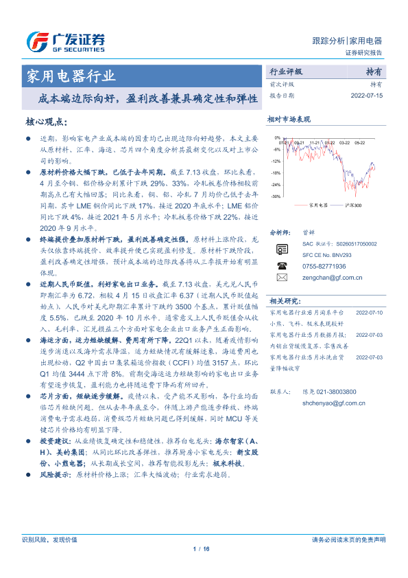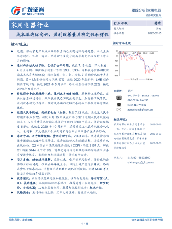 【广发证券】【20220715】家用电器行业:成本端边际向好,盈利改善兼具确定性和弹性-16页