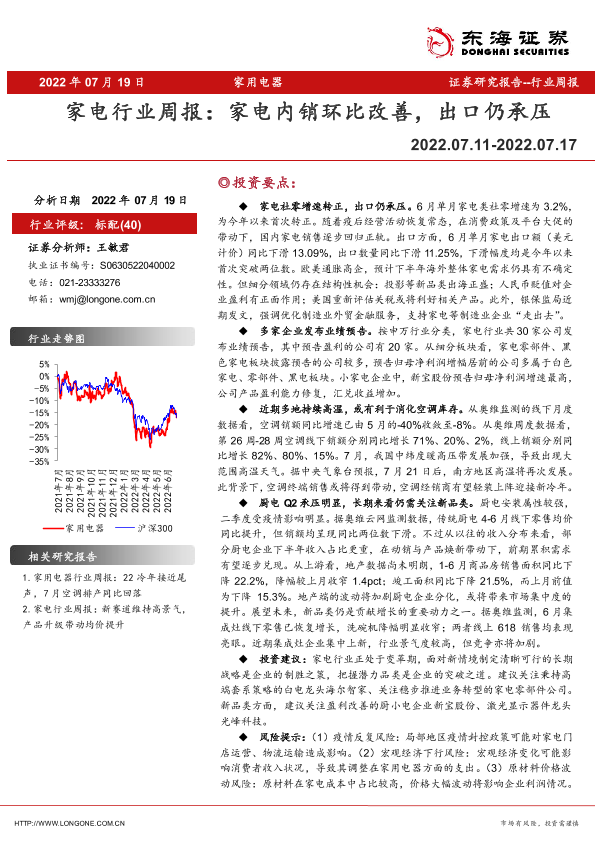 【东海证券】【20220719】家电内销环比改善,出口仍承压-9页