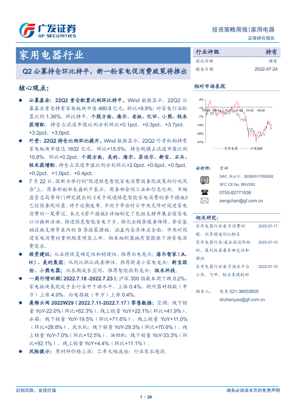 【广发证券】【20220724】20220724-广发证券-家用电器行业投资策略周报:Q2公募持仓环比持平,新一轮家电促消费政策将推出-24页