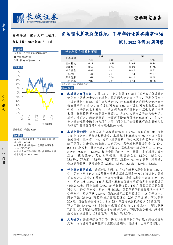 【长城证券】【20220731】家电2022年第30周周报:多项需求刺激政策落地,下半年行业改善确定性强-27页