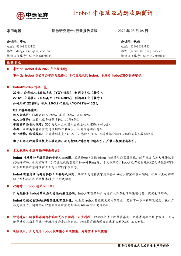 【中泰证券】【20220806】家用电器:Irobot中报及亚马逊收购简评-2页