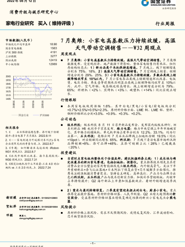 【国金证券】【20220812】20220812-国金证券-家电行业研究W32周观点:7月奥维:小家电高基数压力持续放缓,高温天气带动空调销售-16页