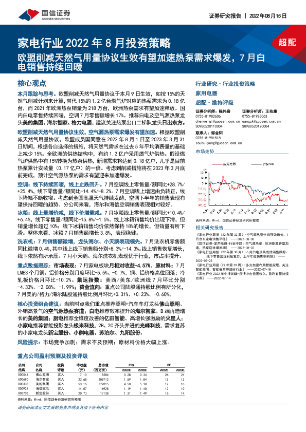 【国信证券】【20220815】家电行业2022年8月投资策略:欧盟削减天然气用量协议生效有望加速热泵需求爆发,7月白电销售持续回暖-18页