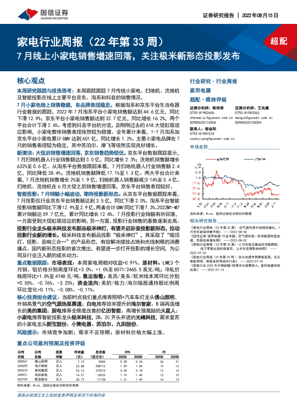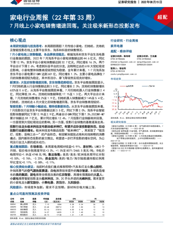 【国信证券】【20220815】家电行业周报(22年第33周):7月线上小家电销售增速回落,关注极米新形态投影发布-15页