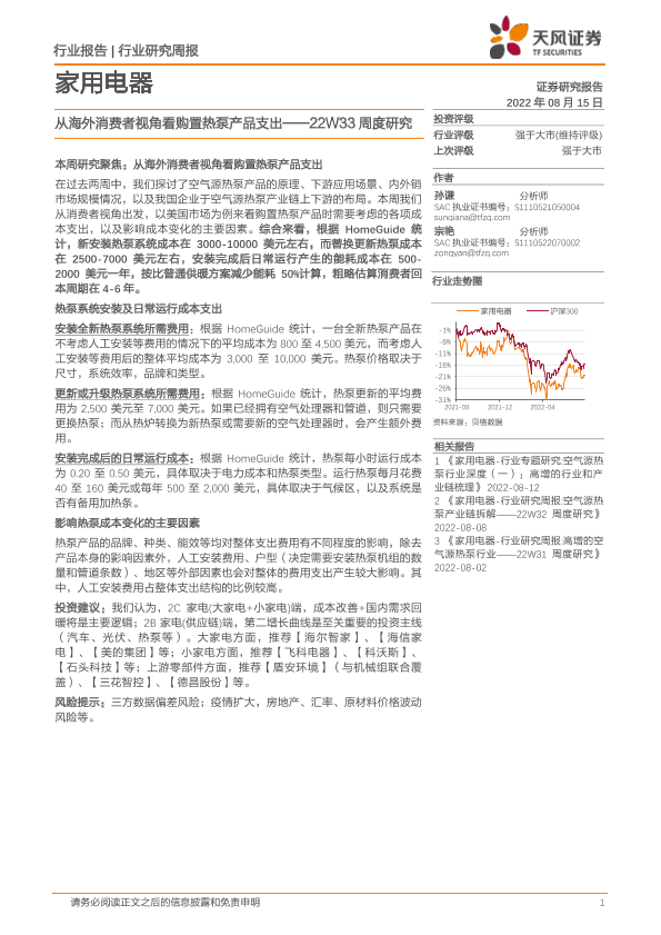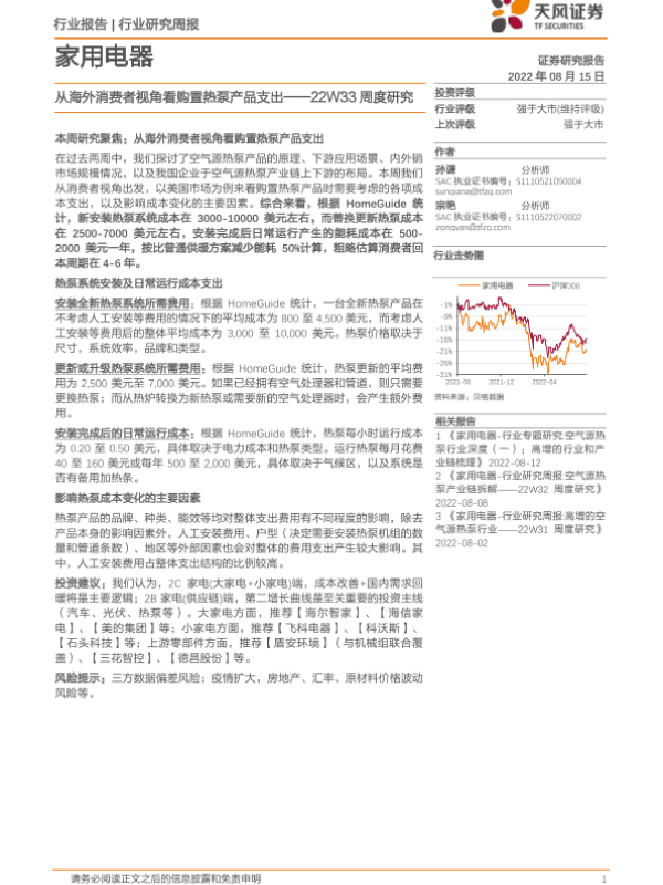 【天风证券】【20220815】20220815-天风证券-家用电器22W33周度研究:从海外消费者视角看购置热泵产品支出-19页