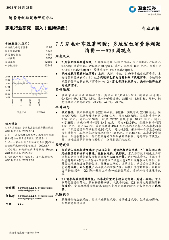【国金证券】【20220821】20220821-国金证券-家电行业研究W33周观点:7月家电社零显著回暖;多地发放消费券刺激消费-16页