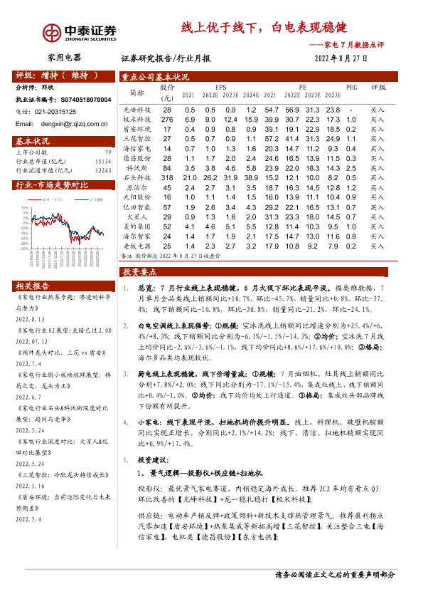 【中泰证券】【20220827】家电7月数据点评:线上优于线下,白电表现稳健-16页
