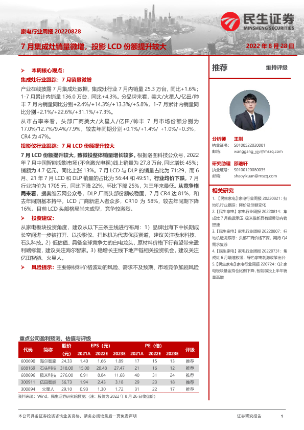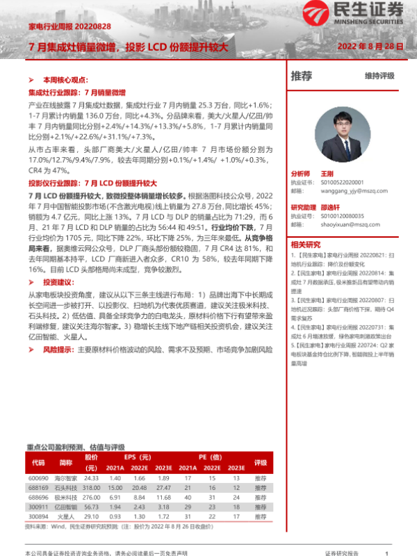 【民生证券】【20220828】家电行业周报:7月集成灶销量微增,投影LCD份额提升较大-13页