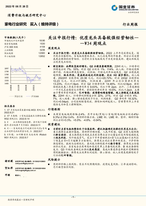 【国金证券】【20220828】20220828-国金证券-家电行业研究W34周观点:关注中报行情:优质龙头具备较强经营韧性-16页