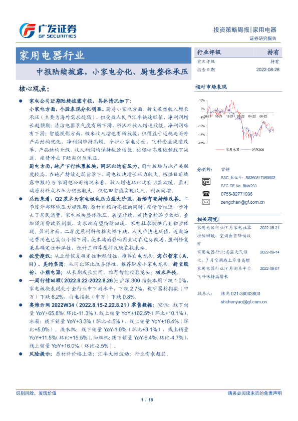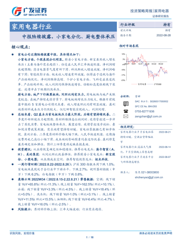 【广发证券】【20220828】家用电器行业投资策略周报:中报陆续披露,小家电分化、厨电整体承压-16页