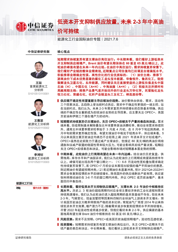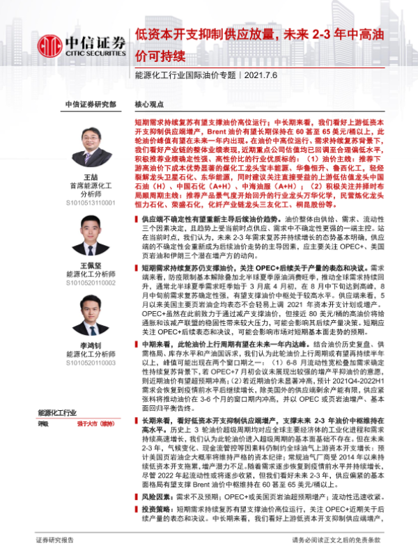 【中信证券】【20210706】能源化工行业国际油价专题:低资本开支抑制供应放量,未来2~3年中高油价可持续-25页