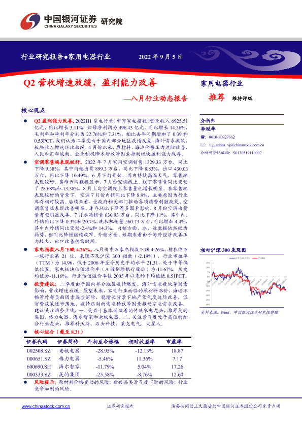 【银河证券】【20220905】20220905-中国银河-家用电器行业八月行业动态报告:Q2营收增速放缓,盈利能力改善-25页