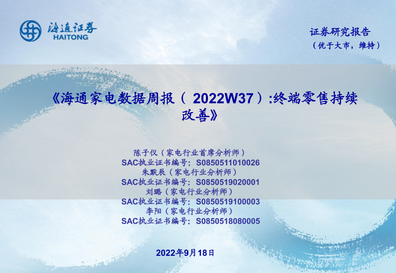 【海通证券】【20220918】海通家电数据周报(2022W37):终端零售持续改善-16页
