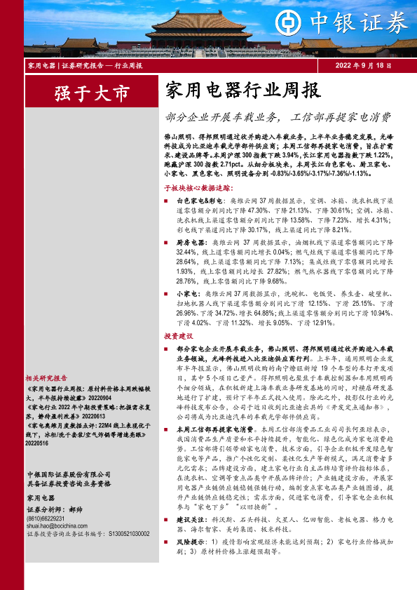 【中银证券】【20220918】家用电器行业周报:部分企业开展车载业务,工信部再提家电消费-28页