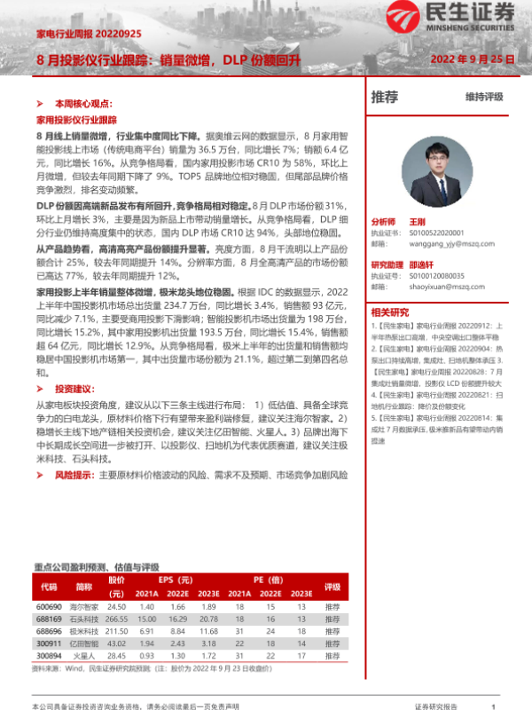 【民生证券】【20220925】20220925-民生证券-家电行业周报:8月投影仪行业跟踪,销量微增,DLP份额回升-12页