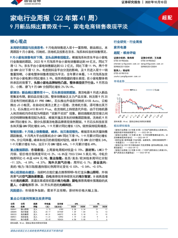 【国信证券】【20221010】家电行业周报(22年第41周):9月新品频出蓄势双十一,家电电商销售表现平淡-14页