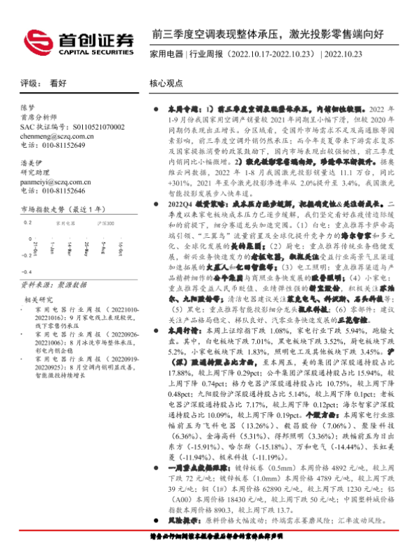 【首创证券】【20221023】20221023-首创证券-家用电器行业周报:前三季度空调表现整体承压,激光投影零售端向好-18页