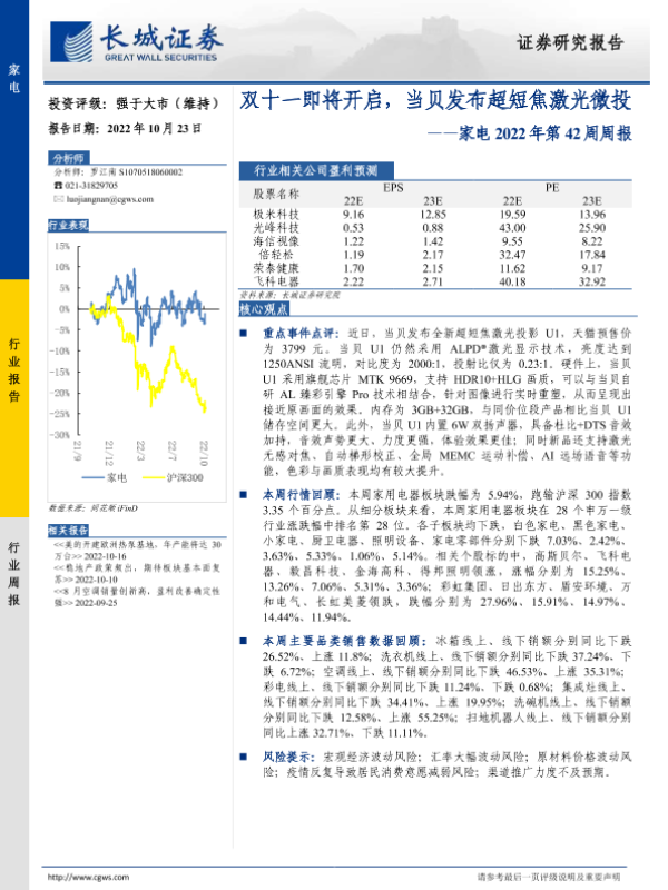 【长城证券】【20221023】家电2022年第42周周报:双十一即将开启,当贝发布超短焦激光微投-25页