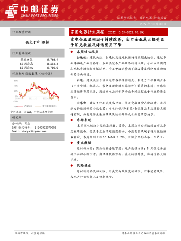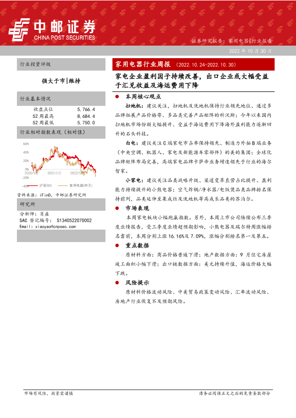 【中邮证券】【20221030】20221030-中邮证券-家用电器行业周报:家电企业盈利因子持续改善,出口企业或大幅受益于汇兑收益及海运费用下降-13页