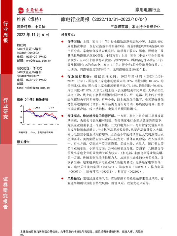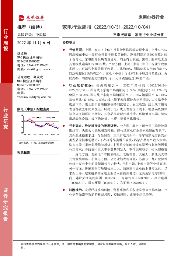 【东莞证券】【20221106】家电行业周报:三季报落幕,家电行业业绩分化-16页
