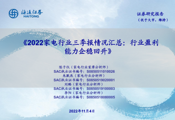 【海通证券】【20221104】2022家电行业三季报情况汇总:行业盈利能力企稳回升-24页