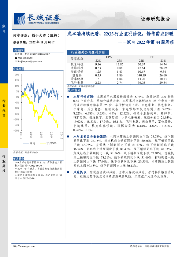 【长城证券】【20221106】家电2022年第44周周报:成本端持续改善,22Q3行业盈利修复,静待需求回暖-26页