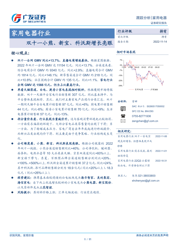 【广发证券】【20221114】家用电器行业:双十一小熊、新宝、科沃斯增长亮眼-11页