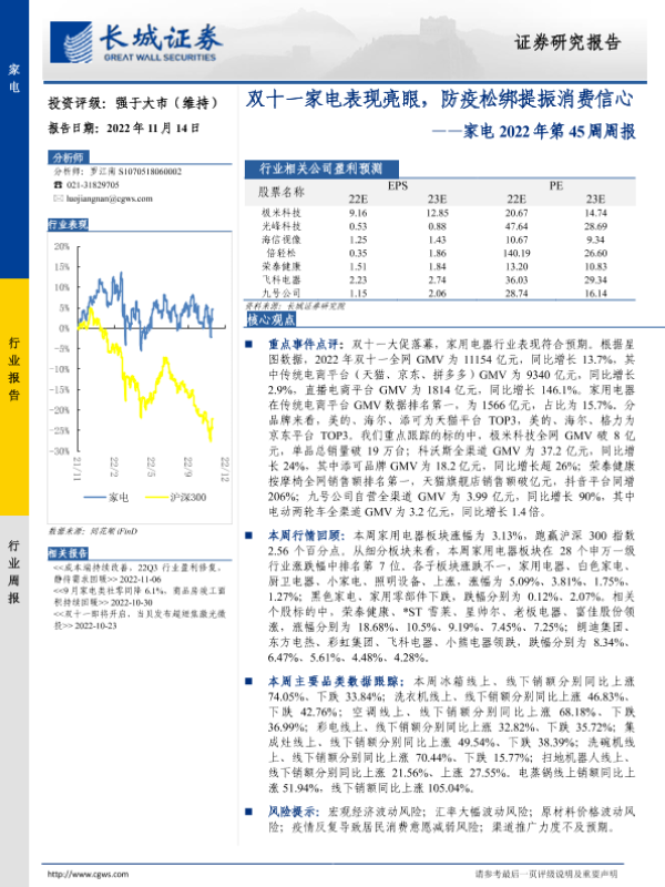 【长城证券】【20221114】2022年第45周周报:双十一家电表现亮眼,防疫松绑提振消费信心-26页