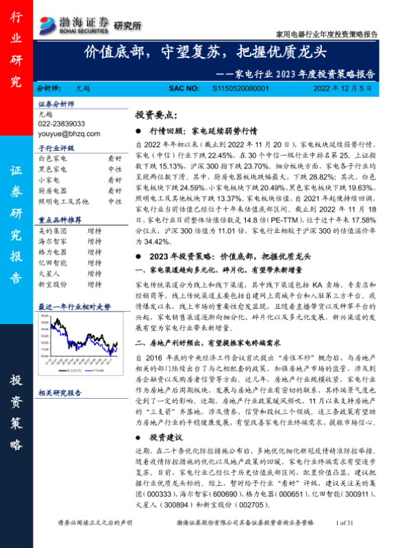 【渤海证券】【20221205】家电行业2023年度投资策略报告:价值底部,守望复苏,把握优质龙头-31页