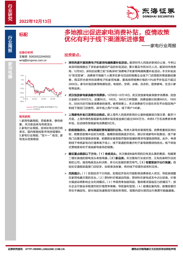 【东海证券】【20221213】20221213-东海证券-家电行业周报:多地推出促进家电消费补贴,疫情政策优化有利于线下渠道渐进修复-10页