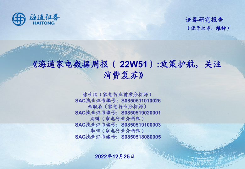 【海通证券】【20221225】海通家电数据周报(22W51) 政策护航,关注消费复苏-15页
