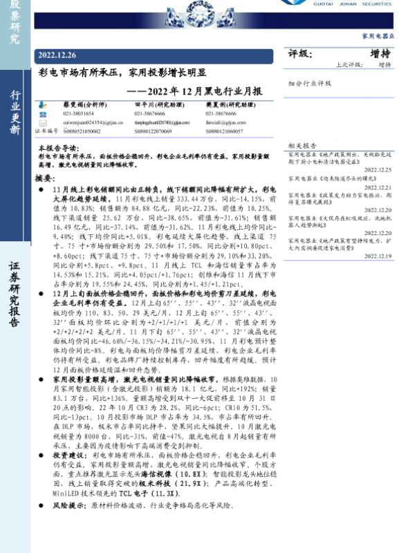 【国泰君安证券】【20221226】2022年12月黑电行业月报:彩电市场有所承压,家用投影增长明显-13页
