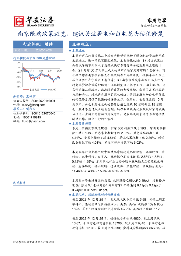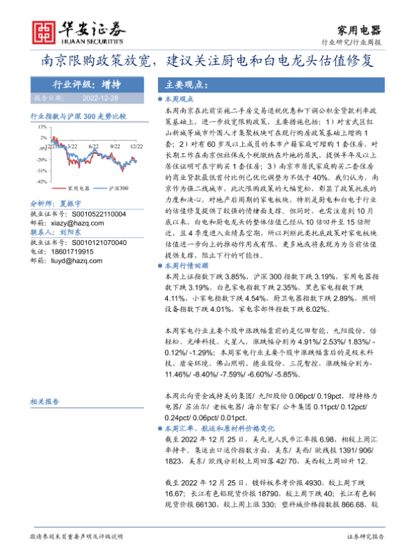 【华安证券】【20221228】家用电器行业周报:南京限购政策放宽,建议关注厨电和白电龙头估值修复-13页
