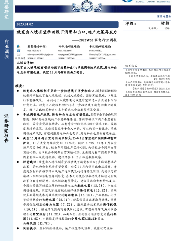 【国泰君安证券】【20230102】2022W52家电行业周报:放宽出入境有望拉动线下消费和出口,地产政策再发力-15页