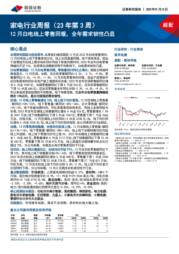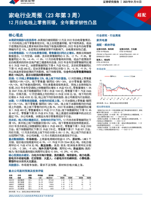 【国信证券】【20230115】20230115-国信证券-家电行业周报(23年第3周):12月白电线上零售回暖,全年需求韧性凸显-17页