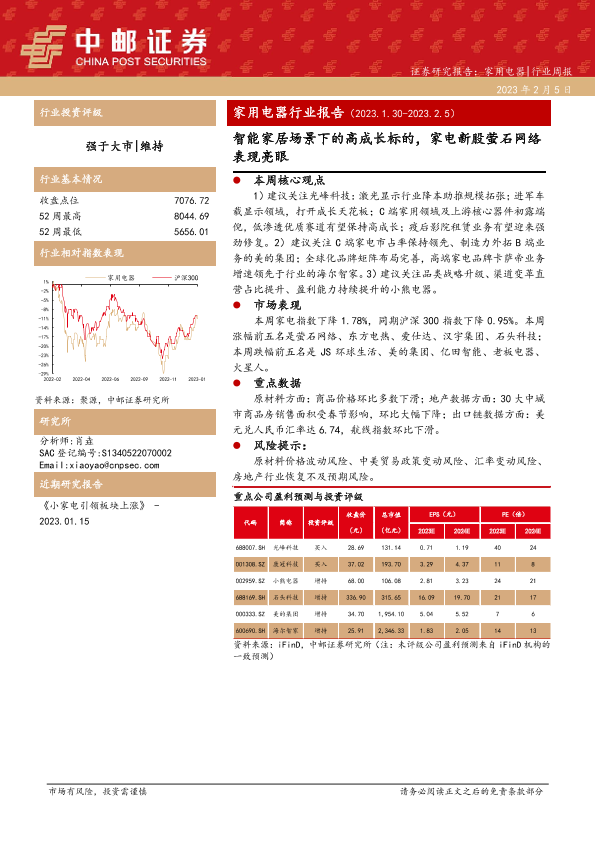 【中邮证券】【20230205】家用电器行业报告:智能家居场景下的高成长标的,家电新股萤石网络表现亮眼-12页