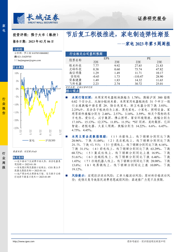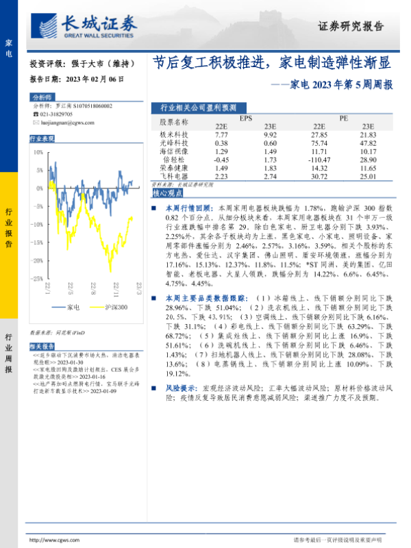 【长城证券】【20230206】家电2023年第5周周报:节后复工积极推进,家电制造弹性渐显-30页